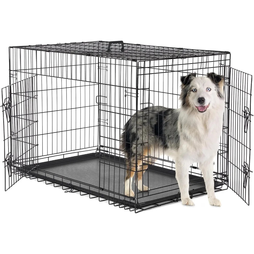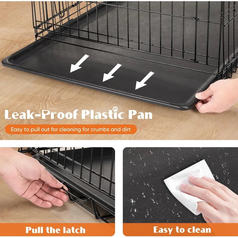 Dog Crate with Divider Panel, 42 Inch Double Door Folding Metal Wire Dog Cage with Plastic Leak-Proof Pan Tray