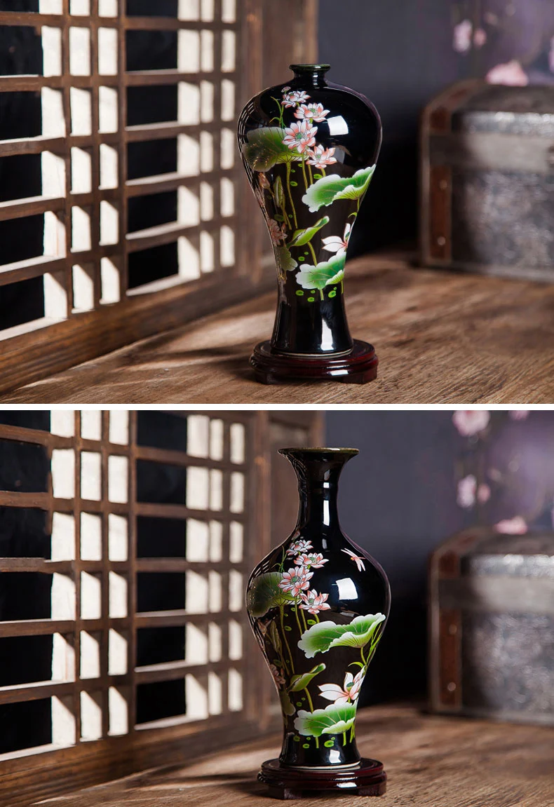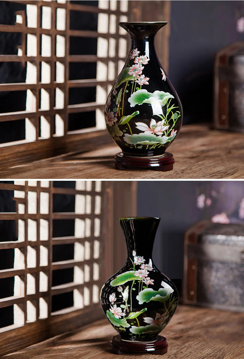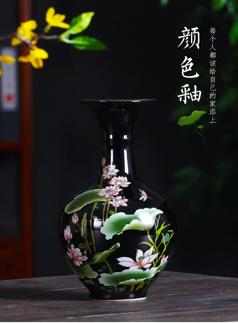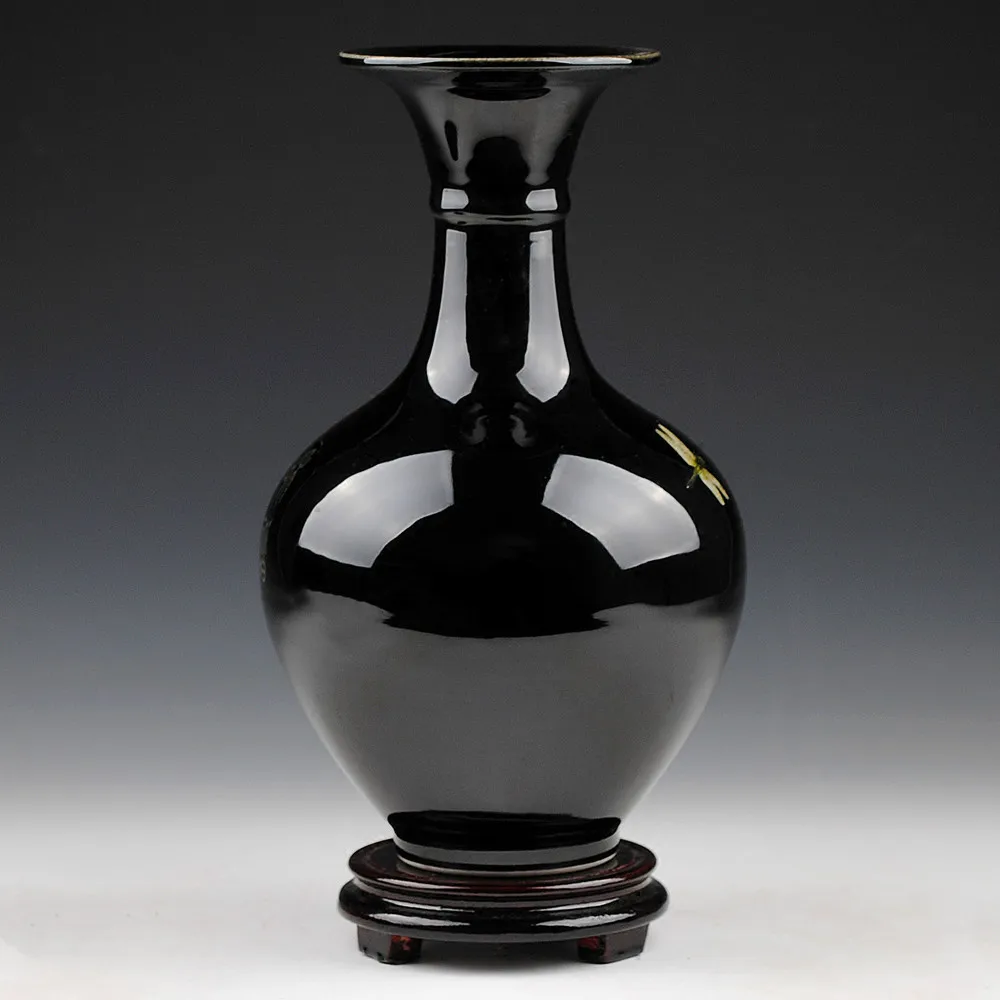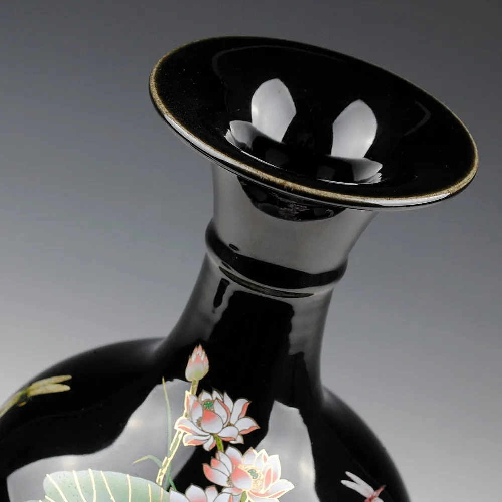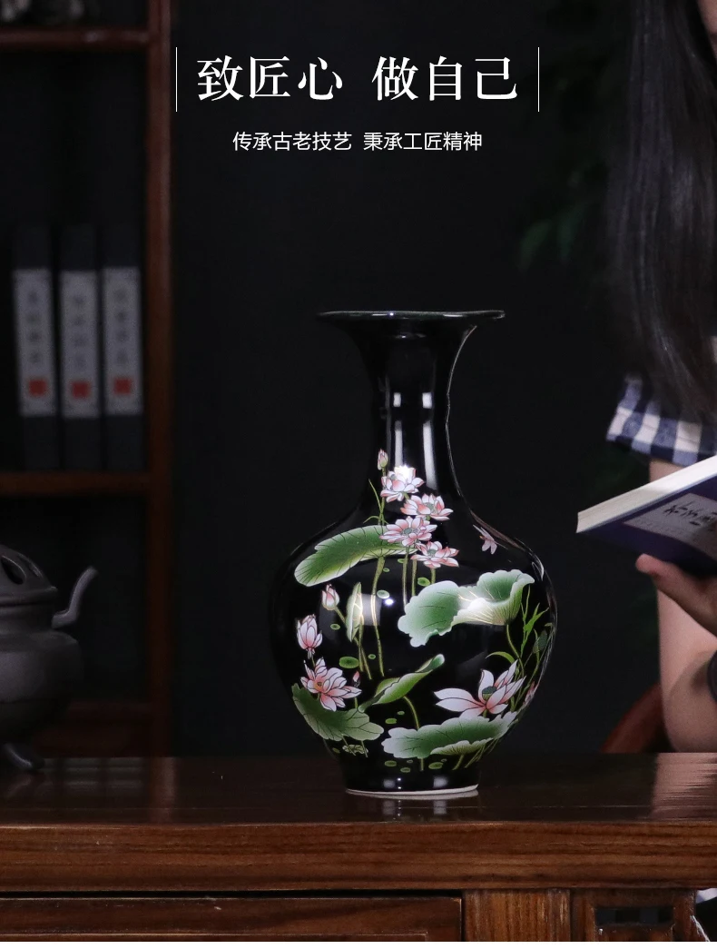 Jingdezhen Sharply Glaze Black Ceramic Vase Lotus Pattern For Modern Home Sitting Room Adornment