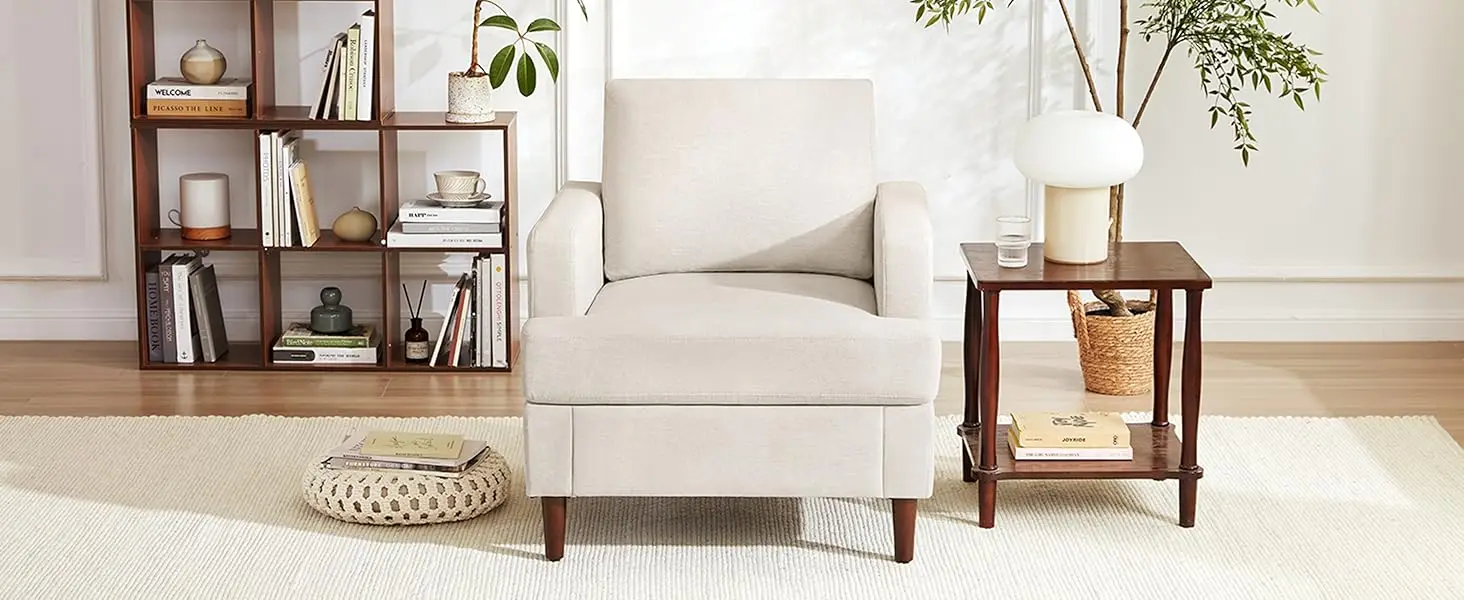 Mid-Century Accent Linen Fabric Armchair for Living Upholstered Reading Accent Chairs for Sofa Chair with Wood Legs