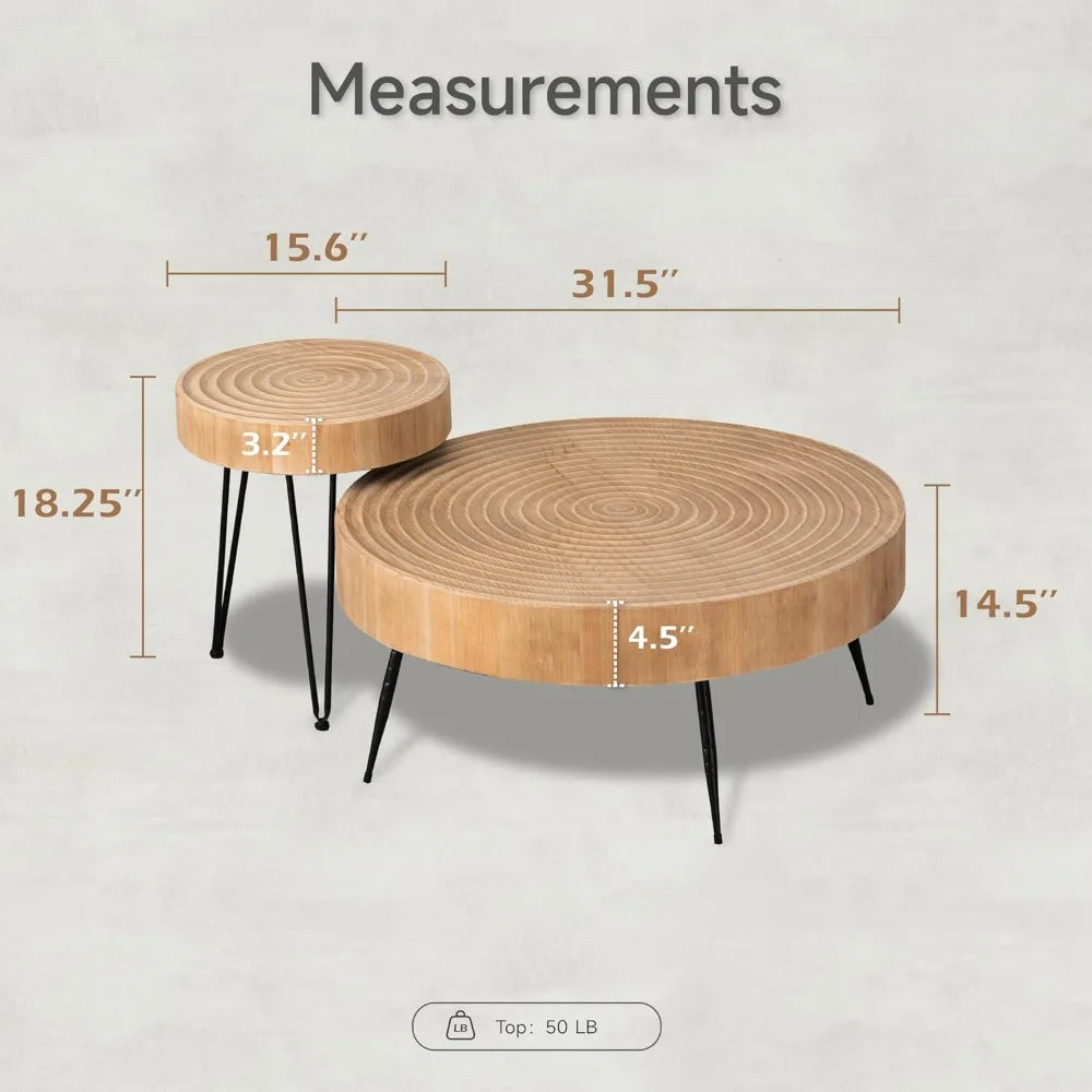 Modern Farmhouse Living Room Coffee Table Set, Nesting Table Round Natural Finish with Handcrafted Wood Ring Motif,