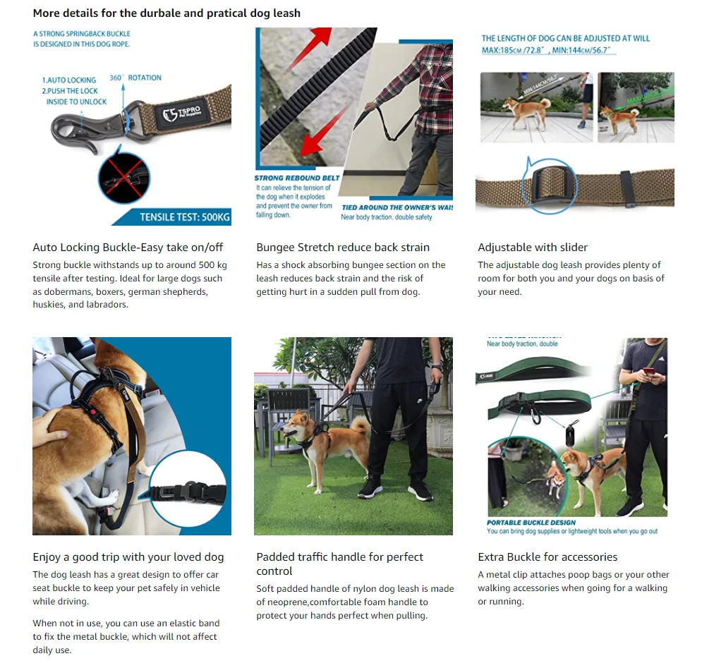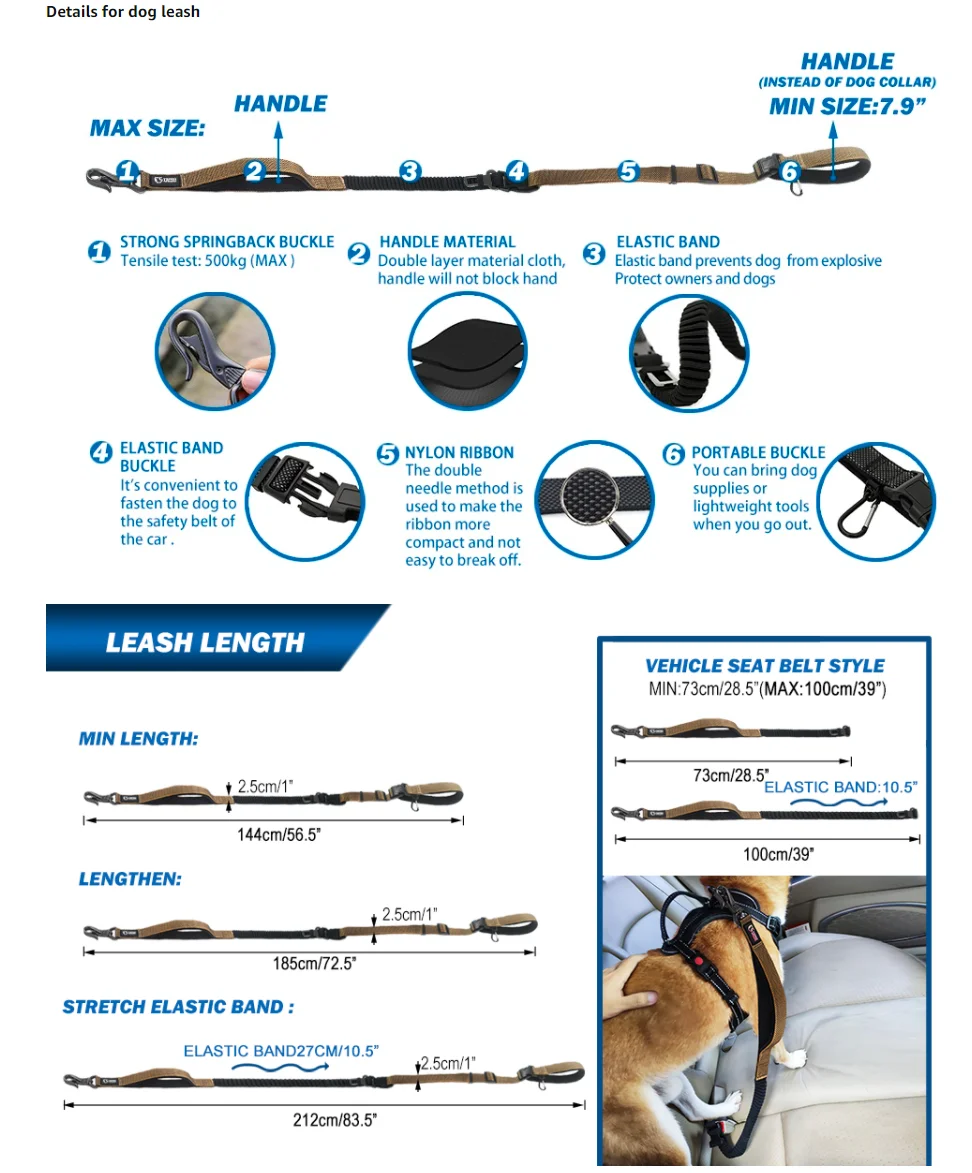 TSPRO Hands Free Dog Leash for Walking Running with Safety Car Seat Belt Shock Absorbing Bungee Leash with Padded Handle